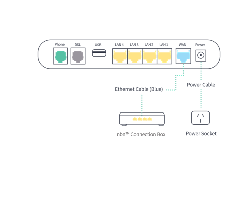 - Next, plug one end of your ethernet cable into the WAN port on your modem, and the other end into the network box provided by nbn®.